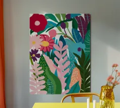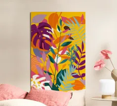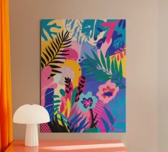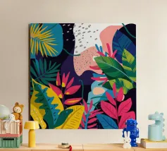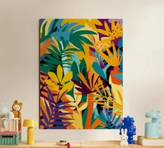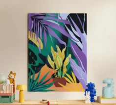 Una lussureggiante scena di giungla incornicia un grappolo d'uva viola, creando una natura morta unica e inaspettata che fonde il fogliame tropicale con la frutta del frutteto in una composizione vibrante.