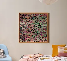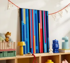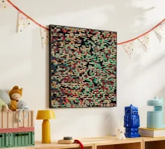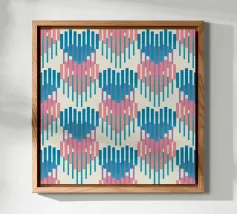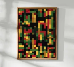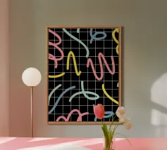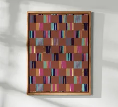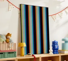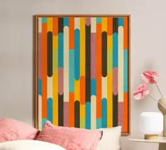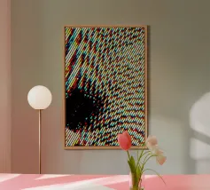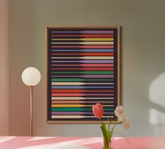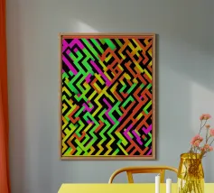 Questa opera d'arte digitale a linee parallele colorate è un pezzo di grande impatto visivo che mette in mostra l'uso di linee precise. L'artista (kathrinmay) utilizza linee di diversa lunghezza per creare un senso di dimensionalità, mentre l'uso dei colori crea equilibrio.