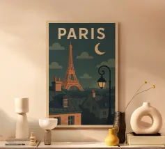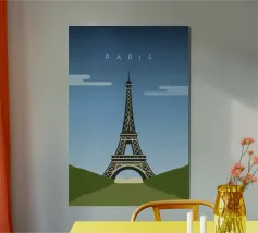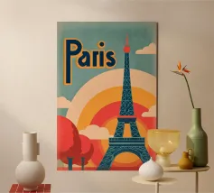 Un poster minimalista e vibrante che cattura tutta la magia di Parigi nell'ora d'oro. La Torre Eiffel si erge elegantemente su una gradazione di viola, rosa e arancione, evocando la poesia di un crepuscolo parigino. Perfetta per un arredamento urbano e chic, questa illustrazione modernizza l'icona francese con stile e morbidezza.