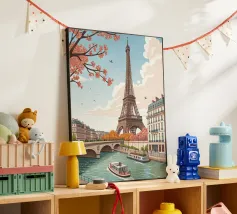 Questo dipinto mozzafiato raffigura la Torre Eiffel che risplende, con le sue luci dorate che brillano sulla superficie calma della Senna. Il ricco contrasto tra la notte blu scuro e la torre radiosa ne evidenzia la bellezza architettonica. L'inclusione di lampioni parigini e figure lungo il fiume aggiunge vita e profondità, celebrando il fascino senza tempo della Parigi notturna.