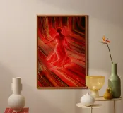 Questo motivo è uno straordinario esempio di arte digitale che utilizza il light painting e crea un'atmosfera mistica, quasi trascendentale. La figura dell'angelo, disegnata in una luce rossa incandescente, sembra muoversi in un flusso di linee ondulate che ricordano l'oro liquido e la lava incandescente. L'opera gioca magistralmente con gli effetti visivi del bagliore e del movimento in un'estetica futuristica. È un'immagine affascinante che trasporta l'osservatore in un'altra dimensione e porta una potente energia eterea nella stanza.