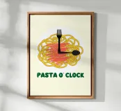 Una grafica giocosa presenta un mucchio di spaghetti con forchetta e cucchiaio disposti come lancette di un orologio, a suggerire che è ora di mangiare la pasta. La frase "PASTA O' CLOCK" è scritta in grassetto sotto.
