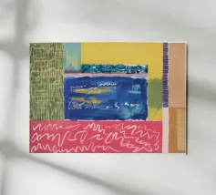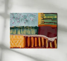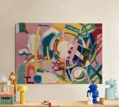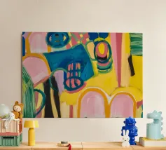 Un patchwork di motivi diversi, tra cui linee e forme a U, nei vivaci colori giallo, blu, rosa e rosso, crea un colorato effetto mosaico in questo pezzo astratto.