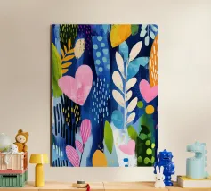 Un patchwork allegro e commovente di piante stilizzate, motivi vivaci e un grande cuore affettuoso. Questa opera d'arte eclettica è una gioiosa celebrazione dell'amore, della crescita e della bellezza artigianale.