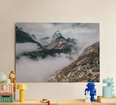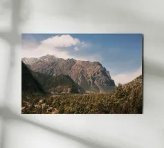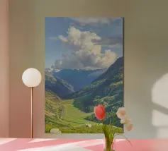 Un viaggiatore solitario si aggira lungo una tortuosa strada sterrata, incorniciata da imponenti cime montuose e da un cielo azzurro infinito. Questa stampa accattivante cattura l'essenza dell'avventura, della solitudine e della cruda bellezza della natura, perfetta per chi sogna paesaggi immensi e natura selvaggia.