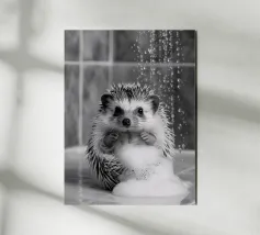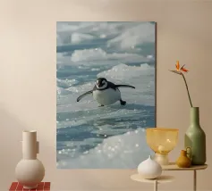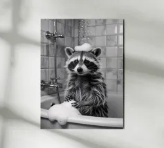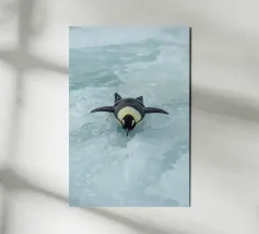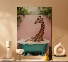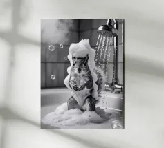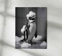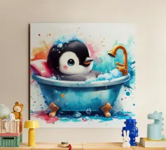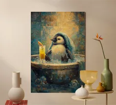 Un pulcino di pinguino è circondato da soffici bolle mentre è seduto in una vasca da bagno. L'ambientazione del bagno e l'atmosfera giocosa creano una scena affascinante e stravagante.
