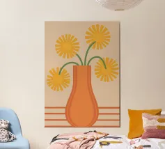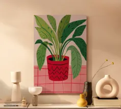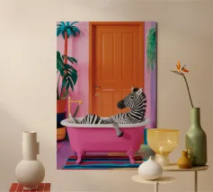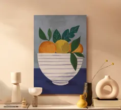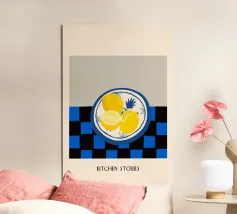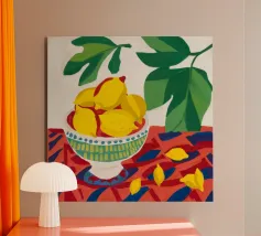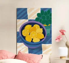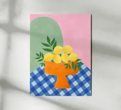 Una moderna natura morta di due pere gialle in una ciotola con un audace motivo a zig zag in bianco e nero. Lo sfondo a scacchi rosa e viola aggiunge un ulteriore livello di grafica giocosa alla composizione.