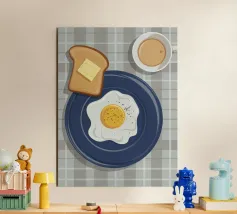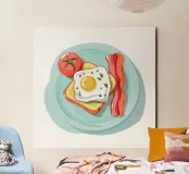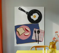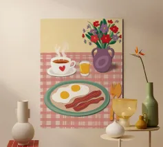 Un'illustrazione semplice e appetitosa di un classico piatto da colazione con un uovo perfettamente fritto, bacon croccante e una fetta di pomodoro su pane tostato.