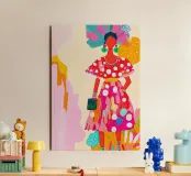 Una vibrante e festosa illustrazione di Pop Art massimalista dominata da una figura femminile stilizzata e sicura di sé. Il soggetto indossa un completo a due pezzi composto da un top rosso a pois e da una gonna intera astratta dipinta con pennellate caotiche ed energiche in rosa shocking, arancione, viola, giallo e verde, stratificate con pois bianchi oversize. Il suo look è altamente drammatico, coronato da un cappello a tesa larga impreziosito da pennellate luminose e piumate di colore verde acqua e rosa. Accessoriata con collane di perle stratificate, grandi orecchini verdi e verde acqua e una pochette blu scuro. L'intera composizione è ambientata a