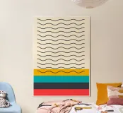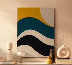 Accattivante stampa astratta in stile Mid-Century Modern, caratterizzata da una sezione superiore di sottili linee ondulate orizzontali su uno sfondo crema chiaro, che si trasforma in una composizione di blocchi di colore solido. La sezione inferiore comprende strati di giallo intenso, verde acqua brillante, carbone profondo e rosso vibrante, separati da sottili linee ondulate nere. Il contrasto tra le onde organiche e i blocchi puliti e impilati crea armonia visiva. Questo poster digitale di alta qualità (7000x5000 pixel, 300 dpi) offre dettagli e precisione di colore impeccabili per un'opera d'arte da parete moderna di grande impatto.