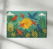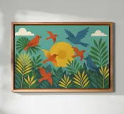 Date un tocco di colore alle vostre pareti con questo poster "Uccelli e sole". Uccelli rossi e blu svolazzano intorno a un sole dorato, circondato da vegetazione tropicale. Un poster retrò luminoso e allegro, perfetto per un look positivo e naturale.