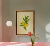 Un'esplosione di sole per le vostre pareti! Questo vivace poster presenta un'illustrazione dettagliata ad acquerello di un ramo di limone fresco, con due limoni gialli dai colori vivaci e un ricco fogliame verde. Il centrotavola botanico è collocato su uno sfondo dinamico e allegro di strisce verticali gialle e bianche, il tutto reso con una finitura pittorica morbida e strutturata. La combinazione di design pulito e colori allegri crea un'estetica accogliente e fresca. Questo poster digitale di qualità superiore (7000x5000 pixel, 300 dpi) garantisce la ricchezza dei colori e la qualità della texture delle strisce.