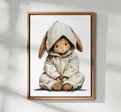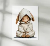 Questo affascinante poster per la cameretta di un bambino presenta un adorabile coniglietto vestito con un pigiama con cappuccio, seduto con uno sguardo tenero e commovente. Realizzata in un delicato stile acquerello, questa illustrazione conferisce morbidezza e comfort a qualsiasi decorazione murale. Ideale per la cameretta di un bambino o di una bambina, crea un'atmosfera calda e avvolgente. Perfetto anche come regalo per il bambino, questo poster farà la gioia di grandi e piccini.
