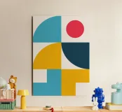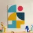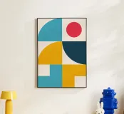 Uno straordinario poster astratto caratterizzato da una disposizione modulare di forme geometriche pure, eseguite in una tavolozza pulita e allegra di turchese/azzurro, giallo senape, blu navy intenso e un vibrante cerchio rosso. La composizione è divisa in sezioni con grandi semicerchi e blocchi a forma di L, creando un flusso visivo dinamico. Un audace cerchio rosso nel quadrante in alto a destra funge da punto focale. Questa opera d'arte è un ottimo esempio dell'estetica Bauhaus e Mid-Century Modern, incentrata su linee pulite e blocchi di colore. Questo download digitale ad alta risoluzione (7000x5000 pixel, 300 dpi) garantisce una superio