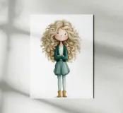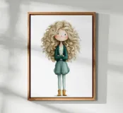 Poster acquerellato che mostra una bambina sorridente con lunghi capelli biondi e ricci, che indossa un vestito verde e stivaletti marroni. Un'illustrazione allegra e poetica, perfetta per decorare la cameretta di un bambino con un tocco morbido e originale.