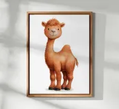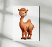 Affascinante illustrazione ad acquerello di un simpatico cammello, dai colori caldi e dall'espressione felice. Un disegno pieno di morbidezza e originalità, perfetto per aggiungere un tocco caldo ed esotico alla cameretta di un bambino o di una bambina.