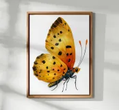 Illustrazione ad acquerello di una farfalla dalle ali giallo brillante, ornata da eleganti motivi neri. Un poster colorato e delicato, ideale per aggiungere un tocco di natura e poesia alla cameretta di un bambino o per una decorazione murale ispirata alle farfalle.