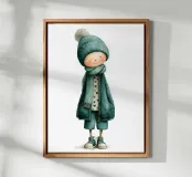 Affascinante poster ad acquerello con un bambino con cappello verde e sciarpa abbinata, in uno stile tenero e poetico. Un'illustrazione piena di dolcezza e innocenza, ideale per dare calore e fantasia alla cameretta di un bambino.