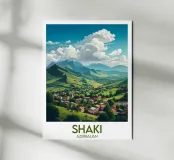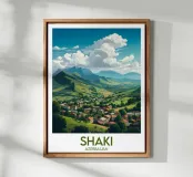 Poster di Shaki, una vibrante illustrazione di questa città azera circondata da verdi colline. Un invito a viaggiare in un paesaggio naturale e autentico.