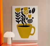Questa composizione giocosa abbina il caffè alle sue origini botaniche. La ridotta combinazione di colori bicolore, giallo senape caldo e nero intenso, ricorda le illustrazioni scandinave della metà del secolo scorso. Piante di caffè stilizzate, chicchi danzanti e forme di foglie decorative spuntano allegramente dalla tazza dorata: una visualizzazione poetica della filosofia farm-to-cup. L'estetica serigrafica bidimensionale e il linguaggio ingenuo del design conferiscono all'opera un fascino artigianale. Perfetta per la cucina, per le pareti dei bar e per tutti coloro che non vogliono solo bere il caffè, ma vogliono celebrarne l'intera storia.