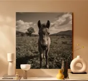 Puledro in piedi in un campo erboso in scala di grigi alluminio dibond