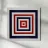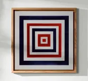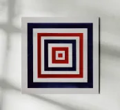 Un'impressionante astrazione geometrica di quadrati concentrici di colore indaco intenso, rosso vivo e bianco netto. L'alternanza di strati crea un audace senso di ritmo, simmetria e tensione visiva, fondendo minimalismo ed energia grafica. Questo pezzo modernista incarna l'equilibrio e il contrasto, rendendolo ideale per gli interni contemporanei con una forte attenzione al design.
