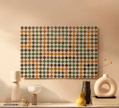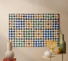 Quest'opera d'arte cattura un sorprendente disegno di piastrelle di Matosinhos, in Portogallo, dove forme geometriche e colori retrò si fondono in perfetta armonia. Il disegno astratto, con i toni dell'ocra, della lavanda, dell'oliva e del crema, riflette un'estetica moderna di metà secolo, pur mantenendo l'eredità culturale dei tradizionali azulejos portoghesi.