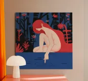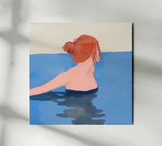 Il dipinto raffigura una persona con i capelli rossi, seduta vicino all'acqua, che ne tocca la superficie con un dito. Lo sfondo è blu scuro con fogliame rosso.