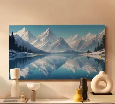 Un cielo azzurro e limpido si riflette perfettamente in un lago sereno circondato da maestose montagne innevate. Questa splendida scena cattura l'essenza della bellezza e della tranquillità della natura.