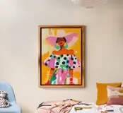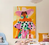 Uno straordinario e vibrante ritratto di Pop Art massimalista che trabocca di colori e texture. Il volto della figura femminile è ombreggiato da un drammatico cappello da sole a tesa larga e sovradimensionato nei toni del rosa chiaro e caldo. Indossa un festoso top e un abito off-the-shoulder, con motivi a pois astratti e blob in rosa acceso, verde lime, verde acqua e nero. Gli accessori sono audaci: orecchini circolari massicci in blu e giallo e braccialetti impilati in colori vivaci. Lo sfondo è un'energica texture di giallo sole e arancione brillante, che crea uno scontro cromatico feroce e di tendenza. Questo pezzo è un co