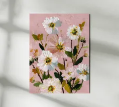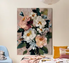 Un dipinto floreale astratto che fonde rosa tenue, oro e avorio con strati espressivi e strutturati. La tavolozza sognante e la pennellata tattile le conferiscono una qualità artigianale: elegante, senza tempo e piena di vita.
