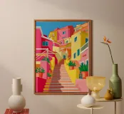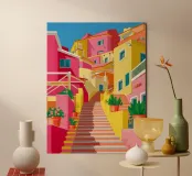 Una ripida scalinata colorata funge da strada in una città mediterranea, fiancheggiata da edifici di colore giallo, arancione e rosa, ornati da piante verdi in vaso.