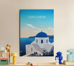 Poster retrò di Santorini, che celebra le sue famose cupole blu e le abbaglianti facciate bianche affacciate sul Mar Egeo. Una composizione pura che cattura l'eleganza e la luce delle Cicladi, perfetta per un arredamento mediterraneo chic.
