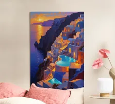 Questo dipinto accattivante ritrae l'incantevole bellezza di Santorini durante il crepuscolo, quando il cielo si trasforma in arancioni e viola profondi. Le case a schiera, illuminate da calde luci dorate, scendono a cascata lungo la scogliera, conducendo lo sguardo verso lo scintillante Mar Egeo. Le piscine a sfioro e le scale creano schemi fluidi che si armonizzano con le curve naturali della costa. Questo capolavoro è una celebrazione dell'architettura unica di Santorini e del magico gioco di luci, colori e paesaggi alla fine della giornata.