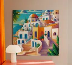 Una scena pittoresca di Santorini è caratterizzata da iconici edifici bianchi con cupole blu e una porta blu vibrante, che si affaccia sul mare scintillante sotto un cielo limpido con uccelli, incarnando il fascino idilliaco dell'isola greca.