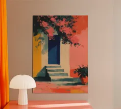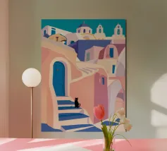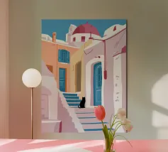 Un gatto bianco sonnecchia pacificamente in un classico arco mediterraneo ornato di bouganville rosa, affacciato su un mare blu. Questo pezzo cattura perfettamente il fascino sereno e solare di un'isola greca.
