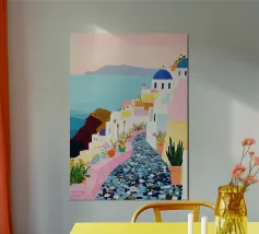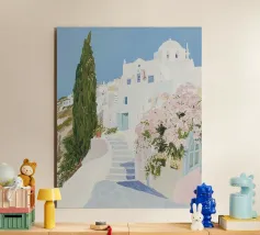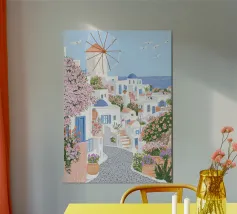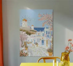 L'immagine mostra un idilliaco paesaggio costiero con case imbiancate a calce, porte e finestre blu e tetti color arancio, che si adagiano come terrazze su una scogliera rocciosa. Sullo sfondo svetta un mulino a vento, mentre il mare blu intenso luccica sotto un cielo limpido. Una vegetazione rigogliosa e fiori colorati costeggiano i sentieri. Lo stile è pittoresco e romantico, ispirato all'architettura mediterranea - in particolare all'isola greca di Santorini - e trasmette tranquillità, calore e bellezza senza tempo.