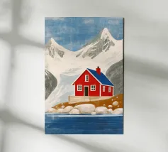L'immagine mostra un idilliaco paesaggio costiero con case imbiancate a calce, porte e finestre blu e tetti color arancio, che si adagiano come terrazze su una scogliera rocciosa. Sullo sfondo svetta un mulino a vento, mentre il mare blu intenso luccica sotto un cielo limpido. Una vegetazione rigogliosa e fiori colorati costeggiano i sentieri. Lo stile è pittoresco e romantico, ispirato all'architettura mediterranea - in particolare all'isola greca di Santorini - e trasmette tranquillità, calore e bellezza senza tempo.