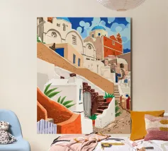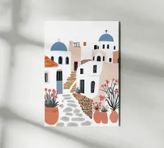 La scena pittoresca di un villaggio bianco di Santorini, con la sua classica chiesa a cupola blu, è ravvivata da fiori di bouganville rosa vibrante che si arrampicano sui muri.