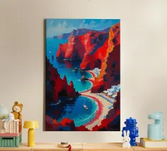 Questo suggestivo dipinto fa rivivere la serena bellezza della Spiaggia Rossa di Santorini, con le sue iconiche scogliere rosse che incorniciano una baia turchese riparata. Piccoli edifici bianchi arroccati in cima alle scogliere aggiungono un tocco del fascino di Santorini, mentre le onde lambiscono dolcemente la riva sottostante. I colori vivaci e i contrasti drammatici evidenziano il fascino senza tempo di questa gemma del Mediterraneo. L'opera d'arte cattura un perfetto momento di pace, invitando gli spettatori a immaginarsi immersi nella magia di questa destinazione unica.