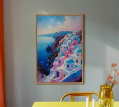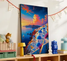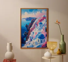 Questo vibrante dipinto impressionista cattura le cascate di cupole bianche e blu di Oia, a Santorini, sullo sfondo del profondo Mar Egeo. Il delicato gioco di tonalità calde dell'alba contrasta meravigliosamente con i blu vividi, creando una vista pittoresca che celebra l'architettura unica dell'isola. Ogni dettaglio, dalle affascinanti facciate alle aspre scogliere, riflette la serena bellezza e la ricchezza culturale di questo idilliaco paradiso greco. L'opera d'arte evoca il fascino tranquillo e l'allure senza tempo che rendono Santorini una destinazione indimenticabile.