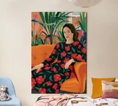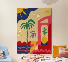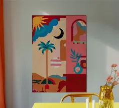 Una scena d'interni stravagante e astratta con una scala rosa, piante in vaso e un sole e una luna nel cielo visti attraverso un arco. L'opera d'arte è un paesaggio da sogno giocoso e bohémien.