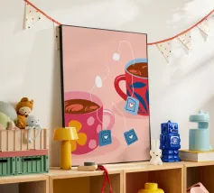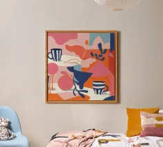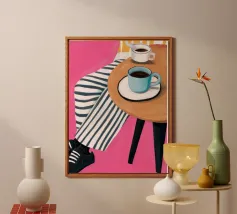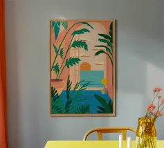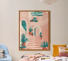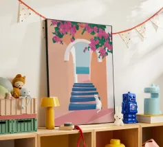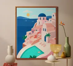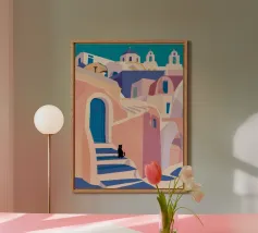 Una classica scena mediterranea che raffigura un edificio rosa con una scala che scende verso un tranquillo mare blu. Quest'opera d'arte cattura perfettamente il fascino solare e pacifico di un'isola greca.