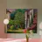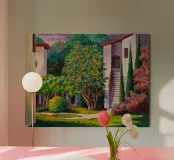Una bella scalinata in pietra, fiancheggiata da un fogliame verde e da vivaci fiori rosa, conduce a una villa serena, creando una scena di giardino invitante e tranquilla, piena di vita e di colori.