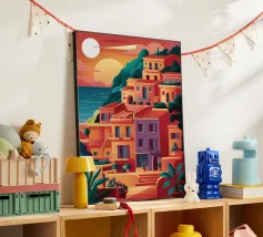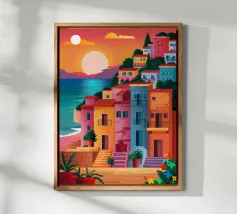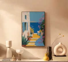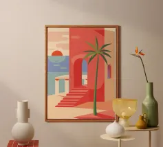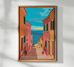 Una vista mozzafiato su una vibrante scalinata mediterranea, fiancheggiata da edifici colorati e palme rigogliose. La prospettiva attira lo sguardo verso l'alto, verso un cielo luminoso, creando un senso di ottimismo, avventura e il sogno di una perfetta fuga estiva.