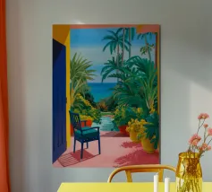 Scale rosse e vivaci conducono verso l'alto passando davanti a una finestra che rivela un cielo soleggiato, una palma e un sole splendente, a simboleggiare un viaggio verso una destinazione gioiosa.
