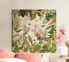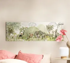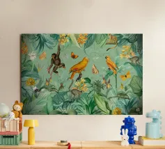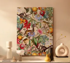 Questo vivace collage vintage mostra un gruppo di scimmie giocose al centro, le cui espressioni curiose e le pose agili conferiscono energia e fascino alla scena. Circondate da un rigoglioso fogliame tropicale e da fiori vivaci, le scimmie interagiscono con l'ambiente circostante, aggiungendo un senso di movimento e malizia. Lo sfondo, ammorbidito da texture vintage, evoca l'atmosfera di una giungla esotica. Il verde intenso e i colori delle piante creano un equilibrio armonioso, unendo la presenza vivace delle scimmie alla bellezza tranquilla di un paradiso tropicale senza tempo.
