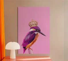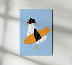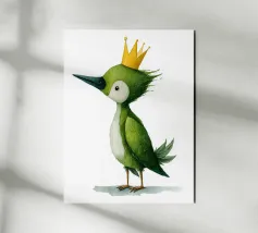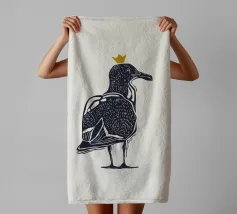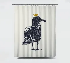 Illustrazione audace e minimalista in stile linoleografico di un gabbiano che si erge con tranquilla sicurezza. La sua forma strutturata in bianco e nero è coronata da una piccola corona dorata, simbolo di resilienza e libertà. Lo sfondo pulito e neutro esalta la sua presenza regale ma ribelle, rendendolo un pezzo di grande effetto e moderno.