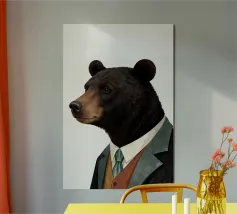 Ritratto realistico ad acquerello di una foca aggraziata vestita con un abito scuro, un gilet color ruggine e una cravatta a righe verde acqua su un morbido sfondo color menta pastello.