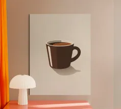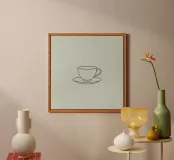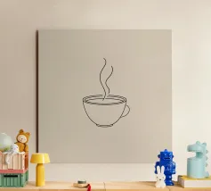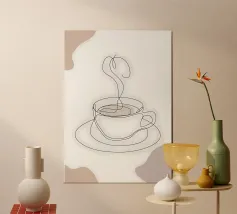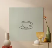 Semplice schizzo di una tazza da tè su un piattino esposto su un minimo alluminio dibond